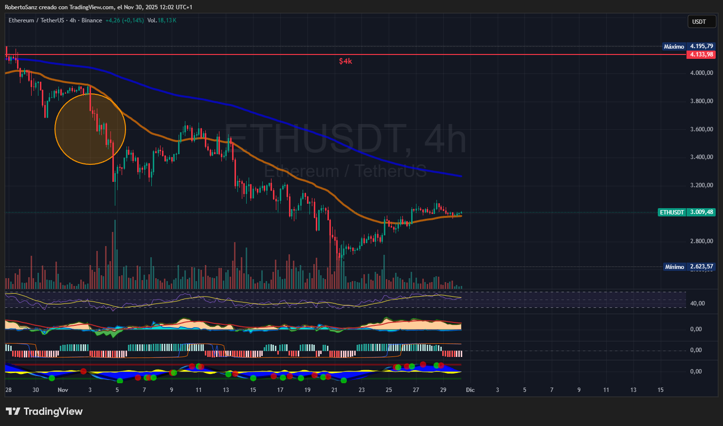 ETH sigue más débil que BTC, especialmente tras la caída fuerte señalada en el círculo de tu gráfico.