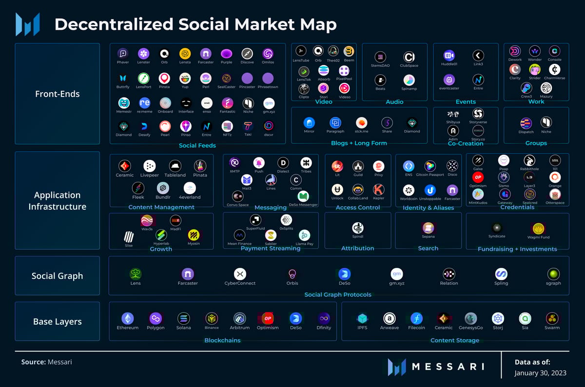 Esta semana quiero empezar por una imagen visual que puedes compartir en tus redes sociales, ya que pertenece a Messari.Los protocolos DeSoc son similares a las redes sociales tradicionales en el sentido de que vinculan los perfiles de usuario con el contenido digital. Los perfiles suelen estar representados como NFT y el contenido que se publica (posts, videos, comentarios) está asociado con el perfil principal, dentro o fuera de la cadena. Ya que la relación entre perfil y contenido es abierta y visible para los desarrolladores, cualquiera puede crear aplicaciones y funciones de front-end en base a esa información. Esto hace que sea más fácil para los desarrolladores crear nuevas aplicaciones e innovaciones.