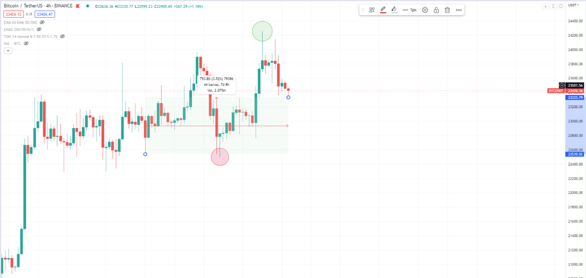 Máximo de 24.300$, mínimo de 22.500$ y lateralizando igualmente.