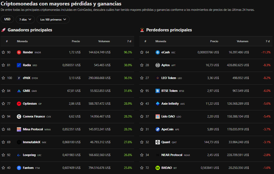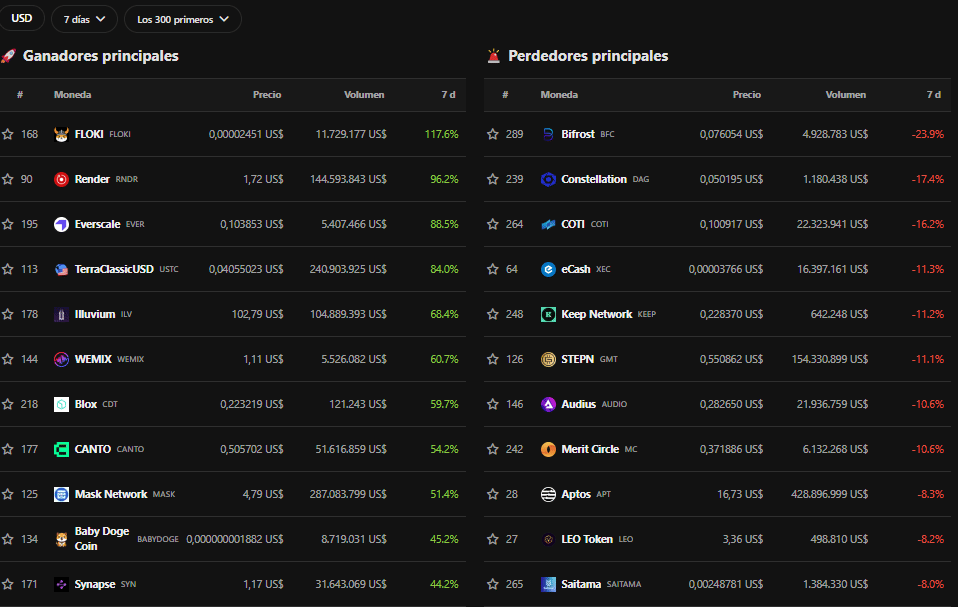 Recuerda que estos listados los mostramos para que puedas hacer tus propias investigaciones de los proyectos en auge durante la semana.Llegar a la conclusión de si se ha tratado de una casualidad, si el equipo quiere pumpear el precio para luego tirarlo y así obtener beneficio, si realmente hay un buen equipo detrás y es una buena oportunidad de inversión, etc. A cosas como esta son las que te ayudaremos en la Newsletter PRO.