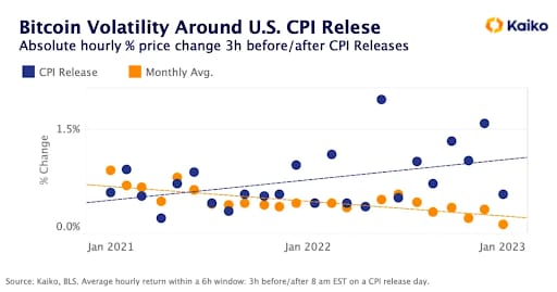 Te voy a mostrar una imagen de Kaiko, en el que indica que Bitcoin está profundamente impulsado por la macro(economía). Su volatilidad tiende a aumentar en torno a la publicación de los datos del índice de precios al consumidor de EE.UU., una tendencia que comenzó en 2022 y que se ejemplifica en este gráfico:
