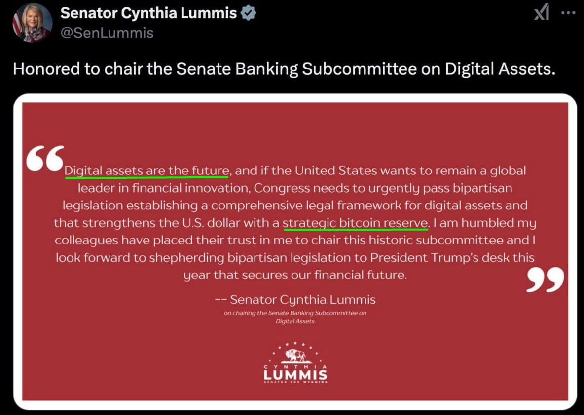 La senadora Cynthia Lummis es nombrada oficialmente presidenta del Subcomité Bancario del Senado sobre Activos Digitales (Mira lo que marcamos en verde)
