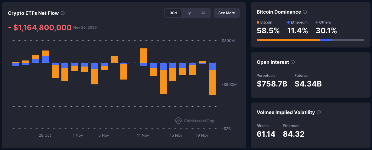 Se están registrando ventas en pérdida masiva: más de US$1,400 millones en BTC en pérdidas en un solo día (20 de noviembre).