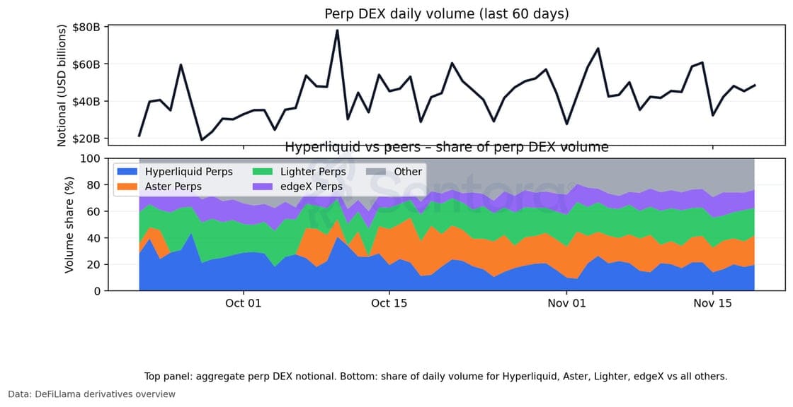 Perp DEX volumen: cayendo un poco pero Hyperliquid manda con ~$9.6B diarios.