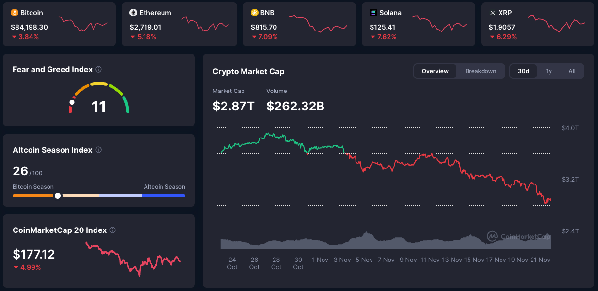 El bajón ya no es una corrección... es un estilo de vida. En seis semanas voló más de $1 billón de capitalización, con BTC bajando ~30% desde su pico de octubre y ahora coqueteando con los $82k.