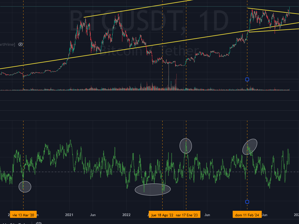 11 de febrero de 2024: Observamos otro pico en el CMF en la zona positiva, lo cual señala una fuerte presión de compra. Este incremento en el CMF puede interpretarse como una señal de continuación alcista. Aunque aún no se ve una reversión, la entrada de dinero es una indicación de que el interés comprador está sosteniendo la tendencia actual, sugiriendo la posibilidad de que el precio continúe al alza en el corto plazo.
